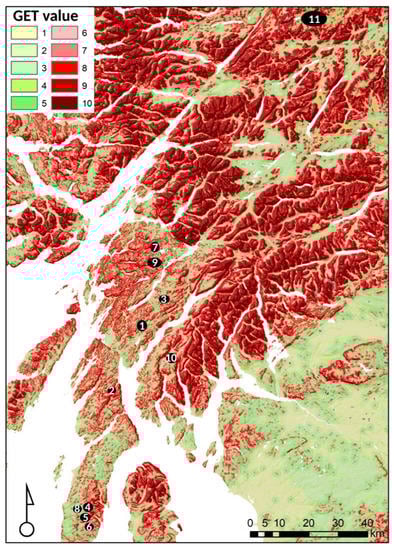 The GET model was not developed for territorial adults but for non-territorial birds during natal dispersal [72]. The model, nevertheless, also has a high predictive capacity for GPS-tagged territorial birds [73]. Agreement between predicted GET values and observed use from GPS-telemetry in 14 territorial eagles was, on average, 96% (range 87–100%, per territorial bird) in correctly identifying preferred habitat across 50 m pixels within territories [73]. Therefore, GET was used to estimate habitat preference in all eagles. Further details of affirmative testing of GET for range-holding territorial birds are in Appendix A.