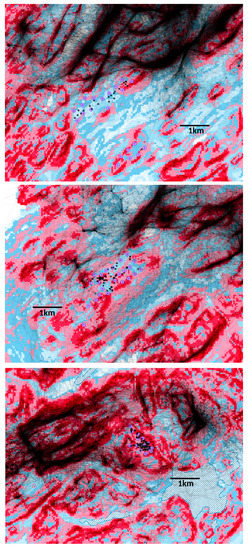 Examples of GPS records of territorial birds at three study wind farms (turbine locations as blue crosses). Upper panel A’Chruach, middle panel An Suidhe, lower panel Beinn Ghlas (see Figure 1 for wider geography and Table 1 for geographic coordinates). Delineated areas with diagonal blue lines show large freshwater bodies (lochs). The backdrop from white to pale blue through pink to increasing intensity of red illustrates GET model values (0–10), with the switch to red (and increasing intensity of red) reflecting predicted preferred habitat (6+) with increasing preference intensity. Records of eagles within the wind farm (3D) are shown with black stars. Black lines show connections between consecutive territorial birds’ records (<1 km as a cut-off, illustratively) for birds whose territorial boundaries enveloped the respective wind farms. See main text and Table 3 for disparity of record numbers within and out with the study’s wind farms.
