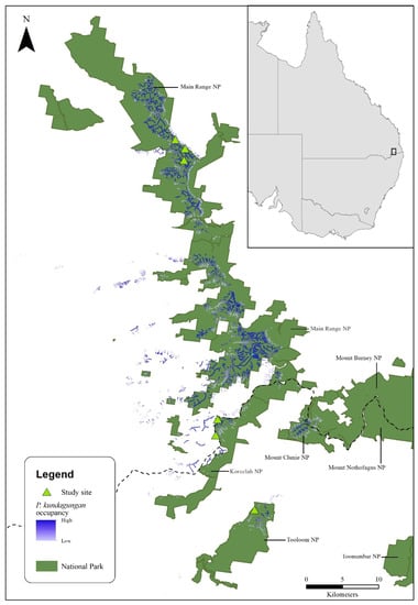 Map showing the location of the six study sites and Philoria kundagungan occupancy probability (adapted from Bolitho et al. [27]) in northeastern New South Wales and southeastern Queensland, Australia.