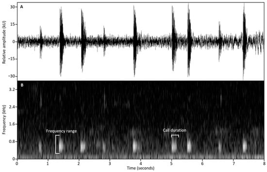 Bioacoustics is a remote sensing technique that utilises audio recognition algorithms to identify the vocalisations of specified species within long-duration audio recordings from the field. Bioacoustics presents a new opportunity to improve traditional methods of studying the ecology of threatened species and can provide detailed insights into ecological parameters such as biodiversity indices, the density of individuals, presence or absence of a species and the timing and duration of seasonal breeding patterns [22,23]. For example, Hoffmann and Mitchell [24] employed bioacoustic techniques to reveal that Geocrinia alba, a critically endangered terrestrial-breeding frog in southwestern Australia, maintains a predictable breeding season that spans multiple months during the Austral spring. However, the study also revealed that declining winter rainfall, which impacts soil water potential and temperature, may lead to shortened breeding periods and fewer breeding opportunities for the species.