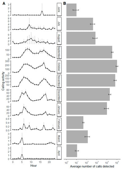 There were strong diel and seasonal calling activity patterns for P. kundagungan. Monthly calling activity peaked in October with 44% of the total calls detected during this month (Figure 4). Calling activity was detected in all months that audio was recorded; however, there was a 47-fold increase in calling activity from August to September and a 71% decrease from November to December. Most calls (87%) occurred between the beginning of September and the end of November (Figure 4). A clear pattern of diurnal calling activity was observed from September through to January, with two distinct peaks. The first peak was approximately two hours after sunrise and the second was approximately two hours before sunset, with the first peak 14% larger than the second. Calling activity was detected during all hours of the day and night; however, calling activity was more common in daylight hours (Figure 4).