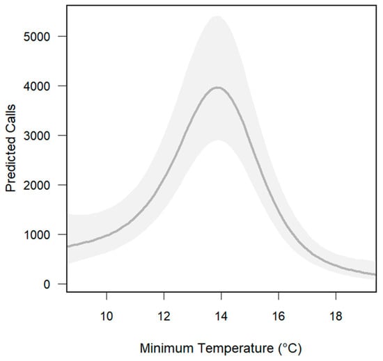 There is a clear relationship between calling activity and substrate temperature (Table 1). The best-supported model suggested that the daily minimum substrate temperature and daily calling activity were correlated with peak calling activity occurring at 13.8 °C (Figure 5). The best-supported model explained 42.3% of the variance in calling activity. The next-best-supported model included the addition of rainfall.