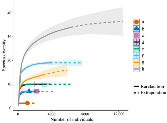 - Hsieh, T.C.; Ma, K.H.; Chao, A. Inext: An R package for rarefaction and extrapolation of species diveristy (Hill numbers). Methods Ecol. Evol. 2016, 7, 1451–1456. [Google Scholar] [CrossRef]