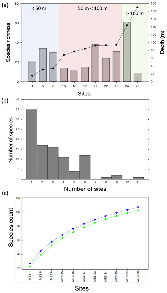 (a) Species richness for each MES site (bars). The secondary y-axis indicates site depth (filled circles) and colour coding defines broad arbitrary depth categories. (b) Occupancy frequency distribution. (c) Species accumulation (rarefaction) curve; upright triangles, MM, inverted triangles, UGE.