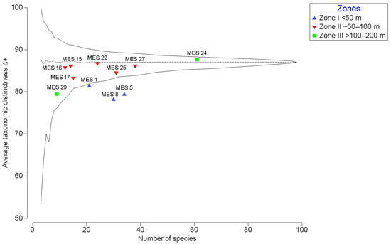 The phylogenetic relatedness of the species in the assemblages, indicated by average taxonomic distinctness (∆+), ranged between 76 and 89 (Figure 3). Greatest ∆+ was observed at MES 24 (depth 144 m), and the least Δ+ was observed in the shallowest and deepest water assemblages (MES 1, MES 5, MES 8, MES 29; Figure 3).