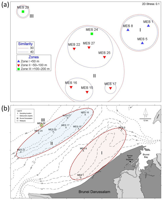 (a) nMDS showing clusters of the eleven foraminifera assemblages for two levels of similarity. Three clusters are formed at the 30% similarity level. Depth zones are indicated by different coloured symbols. (b) A bathymetric map showing that the nMDS pattern of assemblage clustering coincides with distribution relative to the shoreline and depth (i.e., assemblage cluster I is more closely related to II than to III).