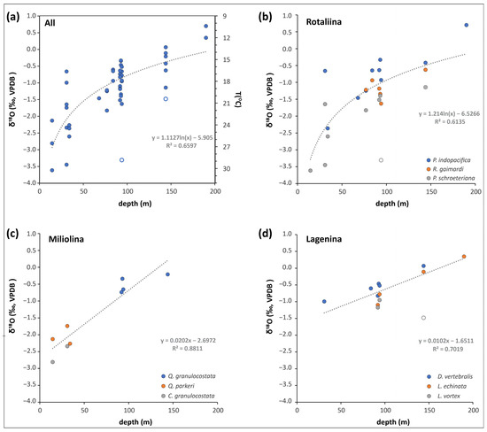 Oxygen isotope compositions of benthic foraminifera from Brunei as a function of their depth occurrence. (a) All the data and related regression lines. Note that the specimens with empty circles are not included in the best-fit function. These are possibly transported from shallower depths. The secondary y-axis indicates temperatures derived from Equation (1) at a δ18Owater value of −0.64‰. (b–d) The δ18O data according to different suborders and their given species. Note that for Miliolina and Lagenina the best fit is represented by a linear function, while for Rotaliina by logarithmic one.