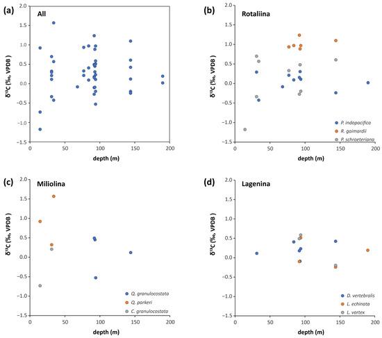 The carbon isotope composition of marine carbonates is generally related to that of the dissolved inorganic carbon (DIC) in seawater (e.g., [71,72]), which is dominated by the bicarbonate ion. The average δ13CDIC for the ocean is 0–1‰, but on the water surface, higher values can be expected due to photosynthesis, while bottom water δ13CDIC is often lower due to organic matter degradation, especially in shelf areas. In shallow coastal settings, continental input may also induce some variation in the DIC composition. The fractionation between marine carbonate and DIC is small and relatively insensitive to temperature, but marine carbonates in equilibrium with DIC generally have 1 to 2 permil higher values than seawater DIC (e.g., [73]). The δ13C composition of foraminiferal tests also depends on the habitat of the given taxa (epi- vs. infaunal, symbiont-bearing taxa, etc.), and some are also known about their vital effect on the isotopic composition when growing their test (e.g., [71]). Generally, the δ13C results from the benthic foraminiferal tests and seawater fit well with the described carbon dynamics and habitat conditions in the shelf areas of Brunei. The overall data scatters around an average of 0.27‰, which variation is larger in shallower depth (<50 m) (Supplementary Table S2, Figure 6a). This latter may be explained by higher amounts and various nutrient sources from the land. When the data are grouped based on the different taxa, some further details can be detected. Lagenids have the most restricted variation in δ13C with no differences among the investigated three species (0.19 ± 0.28‰, n = 13) (Figure 6d). Among the three rotaliids, the two Pseudorotalia species vary more than that of the lagenids, but on average around 0‰. However, the species Rotalinoides gaimardii yielded significantly higher δ13C values of 1.02 ± 0.13‰ (n = 6) (post hoc Tukey test p < 0.05) (Figure 6b). The miliolids are the ones that scatter the most in their δ13C (Supplementary Table S2, Figure 6c), which may indicate access to and alternate use of different carbon sources. Interestingly, the shallow-water species Q. parkeri tend to have higher, more positive δ13C composition when compared to the co-occurring C. granulocostata, which yielded negative values too (Figure 6c). Though only few specimens have been analysed, the observed differences within the rotaliid and miliolid species could indicate different habitats and/or use of different food sources [6], but alternatively could also reflect a different way of biomineralization (i.e., vital effect). A wider scale of study together with in vitro growth of foraminifera could help further studies in these scenarios.