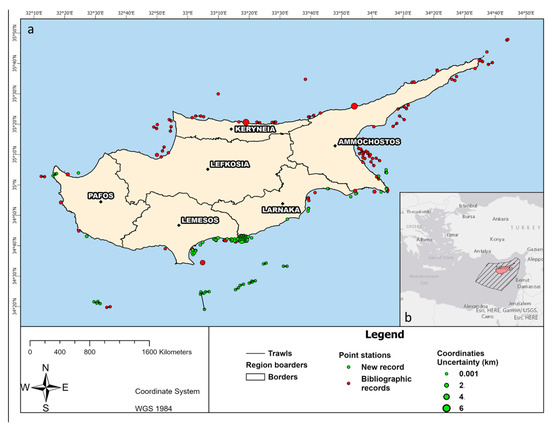 After several decades of research focusing mostly on functional diversity of ecosystems, an unexpected outcome of the current biodiversity crisis consisted of a renewed interest in the so-called alpha-taxonomy, i.e., the identification and description of species occurring in a specific environment [66,67]. In this context, the traditional approach for compiling species checklists, envisaged as tables detailing the geographical distribution of species at a coarse level, usually lacking comments on potential taxonomic uncertainties [35,36], does not seem to be up to the task of providing a relevant tool to face environmental challenges and evaluate biodiversity changes. With this checklist, we aimed at providing georeferenced distributional data for the majority of species reported from Cyprus waters, in order to allow a detailed reconstruction of their distribution.