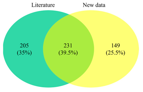 Venn diagram representing the number and percentage of polychaeta species reported in Cyprus from bibliographic references, unpublished surveys, and in both references and new surveys.