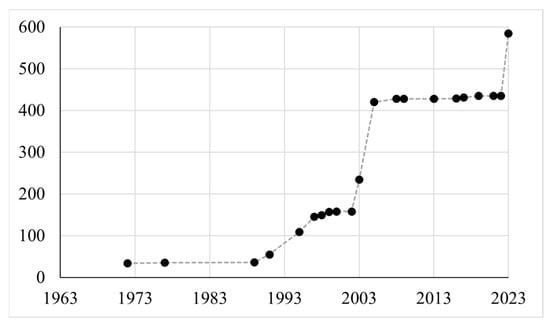 A total of 585 polychaete species belonging to 49 families were recorded along the Cypriot coasts (Table 1; Supplementary Files S1 and S2). Of these, 436 species were reported in the published literature, 231 of which were also retrieved during the implementation of new research surveys; while 149 species were newly reported for Cyprus waters (Figure 2). The distribution of new records in time presents two main sharp increases; during the years 2005–2008, when a total of 262 species were reported, and the year 2023, which refers to the current study (149 new records) (Figure 3).