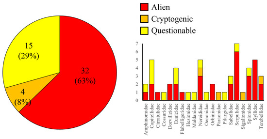The family Syllidae presented the highest number of species (100 species) followed by Serpulidae (44 species) and Sabellidae (39 species) (Table 2). In total, 51 species belonging to 20 families were considered non-indigenous; among them, the families showing the highest numbers of non-indigenous species were Serpulidae (7 species) and Capitellidae, Nereididae, and Syllidae (5 species each). According to the classification used by Langeneck et al. [63], 32 of the non-indigenous species recorded were confirmed as alien species, 4 were cryptogenic, and 15 were questionable (Figure 4, Table 1). The Indo-Pacific Schistomeringos loveni was reported for the first time in the Mediterranean Sea, while four species already reported in literature, namely, Bispira melanostigma, Fimbriosthenelais longipinnis, Leonnates aylaoberi, and Rhodopsis pusilla, were added to the list of non-indigenous polychaetes in the Mediterranean Sea (see Supplementary File S2).