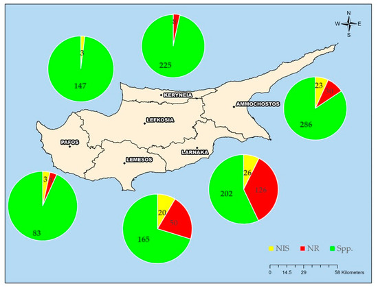 With regard to the non-indigenous polychaetes that were found along the Cypriot coasts, three categories indicated by Langeneck et al. [63] were used: (i) non-indigenous species (NIS): all species whose status of NIS could be confirmed were assigned to this category; (ii) cryptogenic species (CS): following Carlton [64], we defined cryptogenic species as all species with reasonably clear taxonomy that are not demonstrably native or introduced; (iii) questionable species: species records with uncertain occurrence in Mediterranean environments; these are chiefly species that were reported only once in Cypriot waters, whose records were not supported by morphological studies and lack reference material, and which in most cases, were likely to be misidentifications of native species. Following Tsiamis et al. [65], we also included in this category species commonly recorded in Mediterranean environments but showing discrepancies in morphology and/or ecology that might suggest the occurrence of an overlooked undescribed native species.