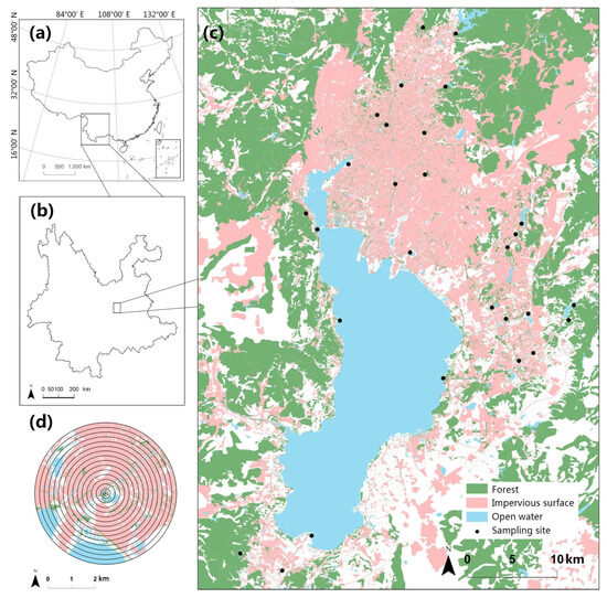 (a) Yunnan province in southwest China. (b) The study area is situated in the central region of Yunnan. (c) The 28 sampling sites are distributed across the research region, comprising green spaces in both new and old city districts. (d) Buffer zones were established around each sampling site, with radii ranging from 100 to 3000 m, providing a total of 16 different scales for assessing landscape properties.