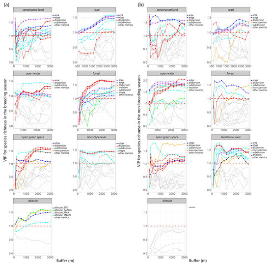 Using PLSR, we evaluated bird richness as a response variable and multiscale landscape metrics as explanatory variables during both breeding (a) and non-breeding seasons (b). We examined the changes in VIP scores across multiple types of landscape metrics for different land-use types across varying buffer sizes, finding that with alterations in the scale of buffer zones, the VIP scores for certain metrics also varied. This indicates a scale dependency in the strength of the correlation between landscape parameters and species richness. The threshold value of 1 was depicted in the graph using red dotted lines.