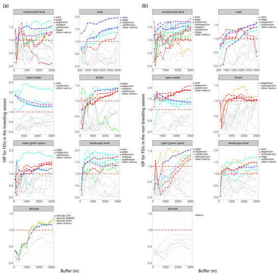 Using PLSR, we evaluated FDis as a response variable and multiscale landscape metrics as explanatory variables during both breeding (a) and non-breeding seasons (b). We examined the changes in VIP scores across multiple types of landscape metrics for different land-use types across varying buffer sizes, finding that with alterations in the scale of buffer zones, the VIP scores for certain metrics also varied. This indicates a scale dependency in the strength of the correlation between landscape parameters and species FDis. The threshold value of 1 was depicted in the graph using red dotted lines.