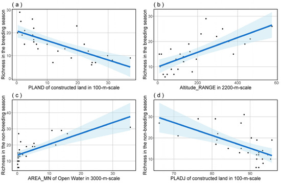 The predictions for bird species richness in both breeding (a,b) and non-breeding (c,d) seasons, based on model averaging, show the effects of significant predictors. The blue shading delineates the 95% confidence interval for the regression analysis.