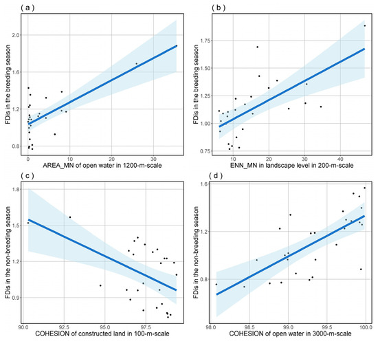 The predictions for bird species FDis in both breeding (a,b) and non-breeding (c,d) seasons, based on model averaging, show the effects of significant predictors. The blue shading delineates the 95% confidence interval for the regression analysis.