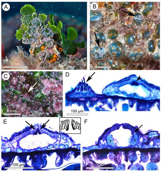 Thalli attached ventrally by cell adhesion on a variety of algal hosts, including Caulerpa, Halimeda, Sargassum, and Valonia (Figure 1A,B). Colour of living thalli whitish or pink to dark red (Figure 1A–C) Growth-form encrusting with a flour-like, powdery covering appearance (Figure 1A–C). Thallus organization dorsiventral, vegetative thallus composed of a single layer of ventral filaments with cells measuring 5–15 µm in diameter and 10–20 µm high, and a single layer of flattened or rounded epithallial cells. Ventral filaments connected laterally by cell fusions. Secondary pit connections and trichocytes not found.