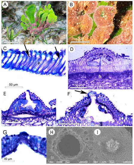 (A–I) Vegetative and reproductive features of Lithophyllum epiphyticum. (A) Crusts attached on the host Udotea flabellum. (B) Magnified view of discoid encrusting specimens showing uniporate tetrasporangial conceptacles. (C) Section through the two-cell layered vegetative thallus showing sinuate palisade cells (p), rounded epithallial cells (e), and secondary pit connections (arrows) linking the basal filament. (D) Section through an immature tetrasporangial conceptacle chamber showing its floor located only one cell below the surrounding thallus surface. Note the host thallus (h) below the sectioned specimen. (E) Longitudinal section through an uniporate tetrasporangial conceptacle showing a partially covered pore canal, and a tetrasporangia with four zonately arranged tetraspores (t). (F) Tetrasporangial conceptacle showing a pore plug (arrow) blocking the canal. (G) Approximate view of a conceptacle pore completely occluded. (H,I) SEM imaging. (H) Approximate view of a tetrasporangial conceptacle with the pore entirely open. (I) Another mature conceptacle with whitish cells blocking the canal. (Underwater photograph by Áthila Bertoncini).