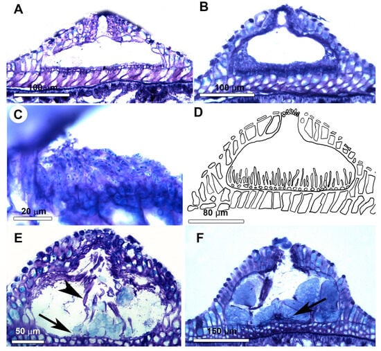 (A–F) Gametangial and carposporangial features of Lithophyllum epiphyticum. (A) Section through an empty male conceptacle with a roof composed of three layers of cells. (B) Section through a male conceptacle chamber showing numerous spermatangial filaments confined to its floor. (C) Magnified view of spermatangial filaments. (D) Diagrammatic drawing of a male conceptacle containing unbranched spermatangial filaments confined to its floor. (E) Carpogonial conceptacle containing branches in the center of the chamber. Note a basal carpogonium (arrow) that extends into a narrow upper trichogyne (arrowhead). (F) Section through a carposporangial conceptacle showing a columella formed by a cluster of fused cells (arrow).