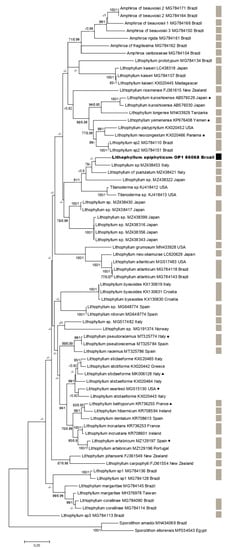 Consensus sequences were built using both BioEdith [31] and Sequencher® (v5.4.6, Gene Codes Corporation), chromatograms were visually checked for ambiguities, and the sequence generated was 888 base pairs. Alignment was performed first using MEGA6, and was then run through MAFFT Version 7 [32] and GBLOCKS to guarantee their quality. The extra sequences used were downloaded from GenBank, and only those with more than 750 bp and published were considered for the main tree (accession numbers in the phylogenetic tree—Figure 4). Sporolithon was picked out as an outgroup. The phylogenetic tree was inferred through the Maximum Likelihood method based on the General Time Reversible model (gamma distribution with invariant sites) at MEGA6 with 1000 bootstrap replicates [33], which were set as complete deletion. The analysis was counted with 71 sequences 751 bp in the final dataset. The intra and interspecific distance calculations were also conducted in MEGA6. The phylogenetic relationships were also examined using Bayesian inference (BI) with MrBayes 3.2.7 [34]. To sample across nucleotide substitution models, the command “lset nst = mixed” was used before running the analysis. Markov Chain Monte Carlo procedure consisted of four independent trials with four chains each. Each chain was run for 2000,000 generations. Posterior probability (PP) values for the resulting 50% majority rule consensus tree were estimated after discarding the first 20% of trees as burn-in.