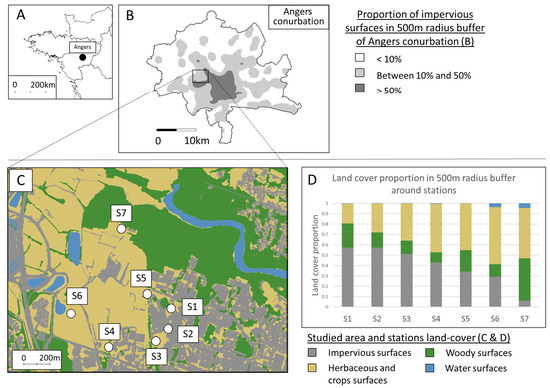 Geographical location of the Angers conurbation in western France (A), spatial representation of the proportions of impervious surfaces in 500 m buffers in the conurbation (B), location of the seven stations in the study area (C), and the land cover proportions in the landscape context (500 m radius buffer) of the seven sampling stations (D).