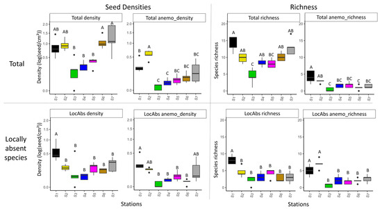 Boxplots of seed densities (without Agrostis sp.) and species richness variation among stations, considering all species (first line) and only locally absent (LocAbs) species (second line). The two variables were tested, both considering all dispersal strategies and focusing on anemochorous seeds alone (anemo). Densities were log-transformed and are represented in square root scale. Different letters indicate significant differences between stations according to ANOVA and Tukey post hoc results with Benjamini–Hochberg p-value adjustment.