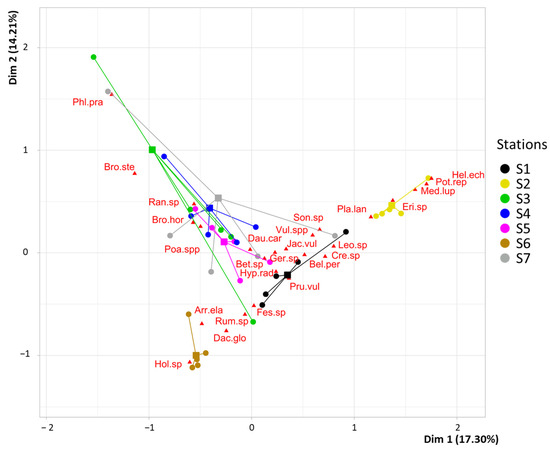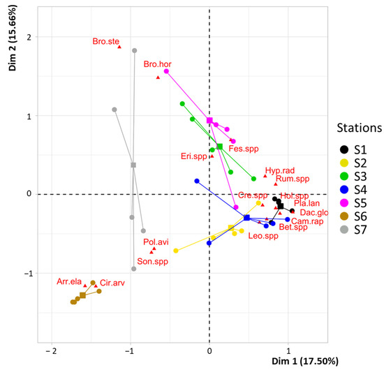 The distribution of plant species in the first factorial plane of the CA is shown in Figure 3. The first two axes accounted, respectively, for 17.3% and 14.2% of total variation. The first axis discriminated the stations with the highest proportions of impervious surfaces in their landscape contexts (S1 and S2) from the other stations. S1 and S2 were characterized by higher occurrences of anemochorous and autochorous species, whereas the other stations had higher occurrences of zoochorous species. Indeed, S1 and S2 were characterized by locally present species in the standing vegetation, either anemochorous (i.e., S1: Hypochaeris radicata L., S2: Helminthotheca echioides (L.) Holub, and an exogen species Erigeron sp.) or autochorous (e.g., S1: Prunella vulgaris L., Bellis perennis L., Geranium sp., and Festuca sp.; S2: Potentilla repens L., Medigo lupulina L., and Plantago lanceolata L.). S1 also contained a few locally absent anemochorous species such as Crepis sp. and Leotondon sp. The other stations, S3 to S7, were characterized by locally present species with zoochorous dispersal strategies (e.g., Phleum pratense L., Ranunculus sp., and Poa sp.) and by locally absent zoochorous species (e.g., Bromus hordeaceus L. Arrhenatherum elatius (L.) P.Beauv. ex J.Presl & C.Presl, Dactylis glomerata L., and Holcus sp.), as well as by locally absent species with other dispersal strategies (e.g., Anisantha sterilis (L.) Nevski, autochorous; Rumex sp., anomochorous). Furthermore, the second axis appeared to distinguish S6, characterized by three dominant Poaceae species (Holcus sp, Dactylis glomerata L., and Arrhenatherum elatius (L.) P.Beauv. ex J.Presl & C.Presl), from the other sites. According to the MRPP (p < 0.001), the species composition of seeds trapped by funnel differed more between stations than between replicates.