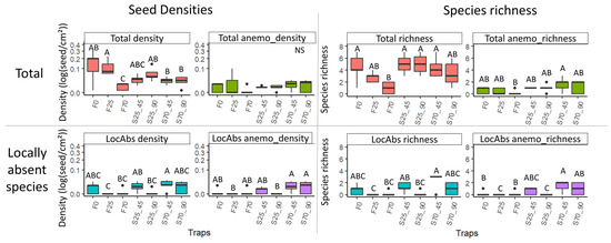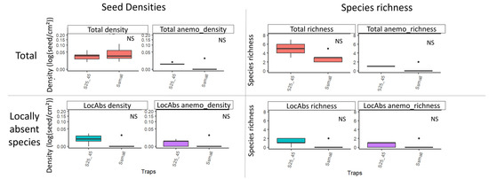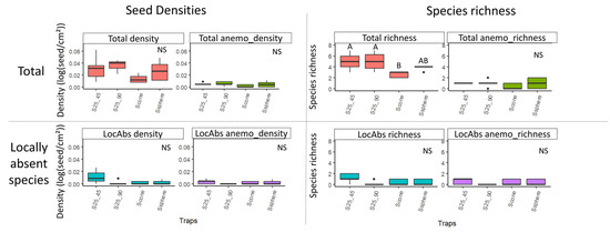 Boxplots of seed densities (without Agrostis sp.) and species richness variability according to trap form, considering all species (first line) and only locally absent (LocAbs) species (second line). The two variables were tested, both considering all dispersal strategies and focusing on anemochorous seeds alone (anemo). Densities were log-transformed and are represented in square root scale. Different letters indicate significant differences. NS: not significant (according to Kruskal–Wallis results with Benjamini–Hochberg p-value adjustment).