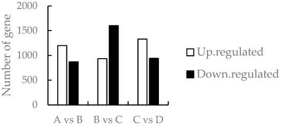 Comparison of the number of differentially expressed genes in A vs. B, B vs. C, and C vs. D groups. Note: A stands for meristematic stage; B stands for bud stage; C stands for first flowering stage; and D is for full flowering stage. A vs. B stands for the meristematic stage compared with the bud stage; B vs. C stands for bud stage compared with first flowering stage; and C vs. D stands for flowering and full flowering stage compared. The same below.