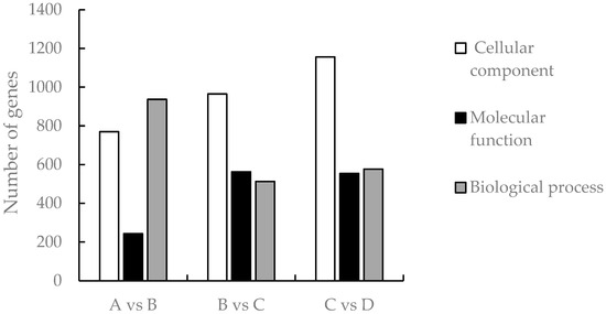 The differentially expressed genes among different developmental stages (A vs. B, B vs. C, and C vs. D) were obtained through screening (Figure 2), showing that 2069 genes were differentially expressed between the meristematic stage and the bud stage, with 1199 and 870 up- and down-regulated genes, respectively; 2536 genes were differentially expressed between the bud stage and the primordial stage, with 934 and 1602 up- and down-regulated genes, respectively; and between the primordial and the full flower stage, the number of differentially expressed genes was 2270, and the number of up- and down-regulated genes was 1330 and 940, respectively. The total number of up-regulated genes was 3463, and the total number of down-regulated genes was 3412.