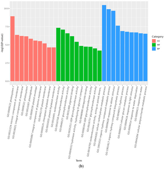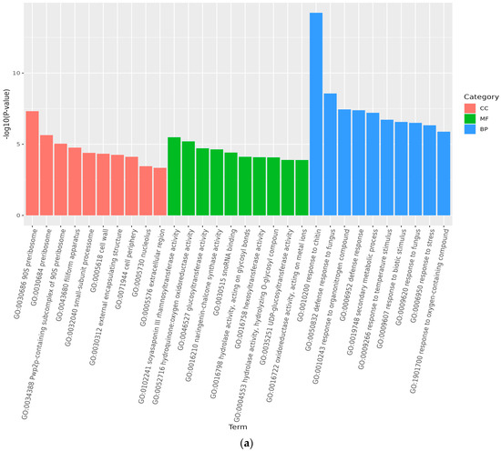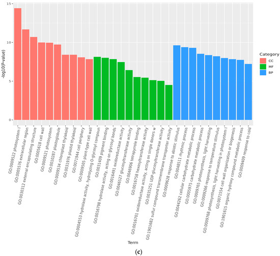 Analysis of GO accumulation may reflect the major biological functions of DEGs in Medicago truncatula during different developmental periods. In this study, comparison of data from adjacent developmental periods revealed that the highest number of differential genes in the cellular component was enriched in Medicago truncatula’s leaves (Figure 3). Among them, 1950 DEGs were enriched in 4768 GO pathways when compared between groups A vs. B (Figure 4a); 2041 DEGs were enriched in 5960 GO pathways when compared between groups B vs. C (Figure 4b); and 2287 DEGs were enriched in 5528 GO pathways when compared between groups C vs. D (Figure 4c).