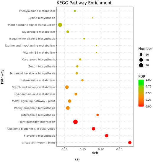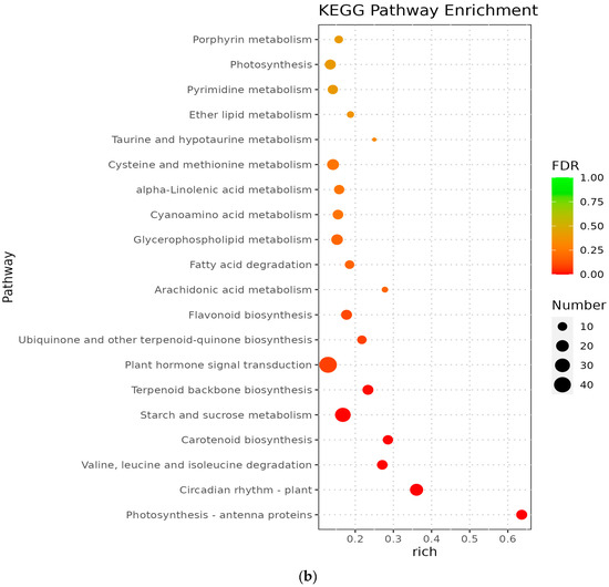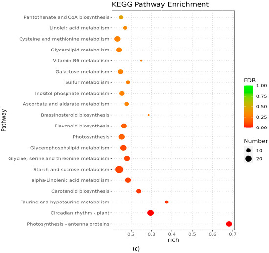 The metabolic pathways with p-value ≤ 0.05 in the three comparison groups were classified as significantly enriched metabolic pathways, and KEGG analysis showed that 596, 806, and 772 differentiated genes were again annotated in multiple metabolic pathways, 105, 114, and 117 in A vs. B, B vs. C, and C vs. D, respectively. The analyses revealed that circadian rhythms, plant pathogen interactions, flavonoid biosynthesis, ribosome bioreactivity in eukaryotes, and diterpene biosynthetic pathways were particularly enriched between groups A and B (Figure 5a); the photosynthetic antenna protein metabolic pathway was the most enriched in groups B and C, followed by circadian metabolic pathways and the degradation pathways of valine, leucine, and isoleucine (Figure 5b); the major metabolic pathways enriched in groups C and D were the photosynthetic antenna protein metabolic pathway, circadian rhythm, taurine and hypotaurine metabolism, and carotenoid biosynthetic pathway (Figure 5c). However, Medicago truncatula was at different stages of growth and development and was found to contain a higher number of differential genes in the plant circadian pathway in all comparisons of groups A vs. B, B vs. C, and C vs. D, namely 17, 22, and 18 DEGs, respectively.