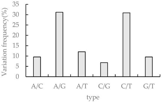 SNPs (single nucleotide polymorphisms) refer to genetic markers formed by single nucleotide variants on the genome. The transformations occurring in SNPs include conversion and subversion, and SNP refers to single nucleotide variants with a frequency of variation greater than 1%. cSNP (coding SNP) denotes the SNP of the protein coding region. The number of cSNP in this study was 312,875, and the highest frequency of A/G and C/T was 31.17% and 30.88%, respectively, while the frequency of the other four single nucleotide variants A/C, A/T, C/G, and G/T were below 15%, 9.55%, 12.05%, 6.8%, and 9.56%, respectively (Figure 6).