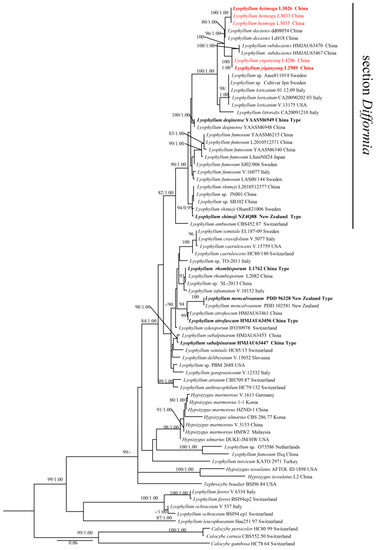 Phylogram generated from maximum likelihood (RAxML) analysis based on combined sequence data of ITS1−5.8S−ITS2 alignment of Lyophyllum. Calocybe persicolor, C. carnea and C. gambosa were used as the outgroup. ML bootstrap support values/Bayesian posterior probability greater than 70%/0.95 are indicated. Species names in red represent new species.