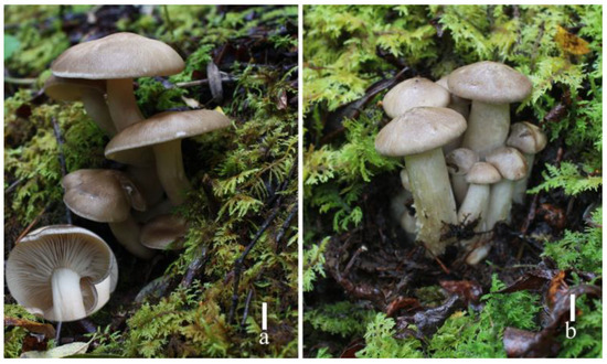 Fresh basidiomata of Lyophyllum yiqunyang ((a) YAAS L2989; (b) YAAS L4206). Scale bars: (a,b) = 1 cm.
