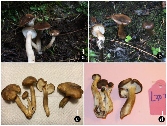 Fresh basidiomata of Lyophyllum heimogu ((a) YAAS L3026, holotype; (b) YAAS L3035; (c) YAAS L3533; (d) YAAS L3033). Scale bars: (a–d) = 1 cm.