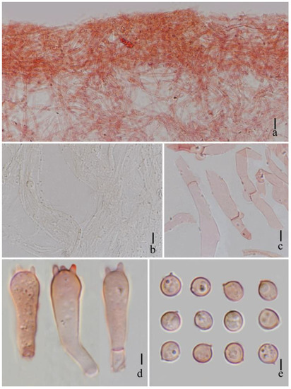 Lyophyllum yiqunyang (YAAS L2989). (a) Pileipellis; (b) Thromboplerous hyphae; (c) Clamp connection; (d) Basidia; (e) Basidiospores. Scale bars: (a) = 20 μm, (b–e) = 5 μm.