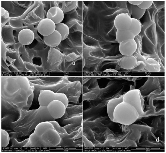SEM photo of Lyophyllum Basidiospores. (a,b) Lyophyllum heimogu (YAAS L3026), (c,d) Lyophyllum yiqunyang (YAAS L2989).