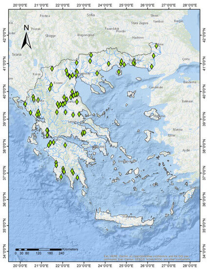 Presence/absence data of macrophytes from 74 river and stream sites were collected during the summer of 2021 and 2022 (Figure 1). The sampled sites belong to the national monitoring network for the ecological quality assessment of inland waters in line with the implementation of the Water Framework Directive (WFD) [41]. The sampling of macrophytes followed national protocols harmonized with European standards.