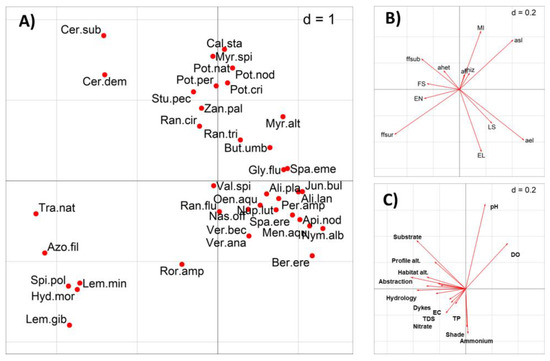 We conducted RLQ analysis to explore the relationships among macrophyte species composition, species traits, and environmental variables [48]. RLQ is an extension of co-inertia analysis that searches for a combination of traits and environmental variables of maximal co-variance, which is weighted by the presence/absence or the abundance of the species in plots [49]. This analysis provides a more general co-variation pattern between traits and environment without any a priori assumption regarding explanatory variables. The method is based on a three-step ordination procedure in which the relationship between environmental variables (R), species presence/absence or abundances (L), and associated traits (Q) are combined into major linear correspondence axes. First, a correspondence analysis (CA) was computed on the species matrix (L). Then, a Hill–Smith ordination was conducted for traits (Q) since traits were considered as a mix of quantitative and factor variables, while the environmental variables (R) were ordinated using a principal component analysis. Both Hill–Smith and PCA ordinations were constrained by the axis of the CA (rows for R and columns for Q). The overall significance of this relationship was tested using a global Monte-Carlo test of the table rows of R and those of Q. The contribution of each trait and environmental parameter to total inertia was used as a measure of relative importance and a criterion to identify the most important traits and environmental factors.