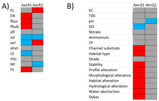 Results of fourth-corner tests for the first two RLQ axes and (A) traits and (B) environmental variables. Blue color indicates significant positive associations, and red indicates significant negative associations at 0.05 level of significance.