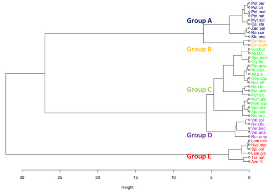 Dendrogram obtained from hierarchical clustering based on the species distances. Colors correspond to the five functional groups (A, B, C, D, and E) derived after the calculation of the Kelley–Gardner–Sutcliffe penalty.