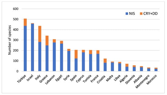 Number of NIS, cryptogenic (CRY) and data deficient (DD) species, detected in each Mediterranean country by December 2020.