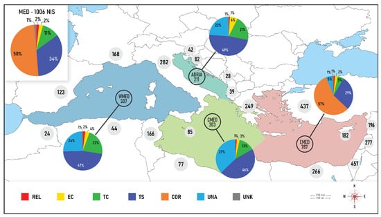 For the rest of the Mediterranean countries, national NIS inventories were provided by national experts designated by the Contracting Parties to the Barcelona Convention, for Albania, Algeria, Egypt, Israel, Lebanon, Libya, Morocco, Tunisia and Türkiye (only including data for the Aegean and Levantine Seas). For a small number of countries that had not submitted national inventories, initial national baselines were created with data retrieved from the Hellenic Centre for Marine Research (HCMR) offline database. Initial inventories were updated and revised according to the recently published literature and major national, regional and taxonomic reviews, as well as data from national monitoring campaigns and citizen science project observations until December 2020 (reported until May 2023). Nomenclature was revised where necessary following the World Register of Marine Species [73]. Revised inventories were validated through several rounds of communication with countries’ national experts, invited consultations with taxonomic experts and two online workshops, whereby many discrepancies were resolved, and a number of controversial species were agreed upon. Subsequently, data were aggregated at the pan-Mediterranean and the subregional level, i.e., the Western Mediterranean Sea (WMED), the Adriatic Sea (ADRIA), the Ionian Sea and the Central Mediterranean Sea (CMED) and the Aegean and Levantine Sea (EMED).