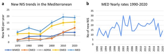 In the last decade the increasing trend appears to be levelling off, although values for 2010–2020 may still change, given the lag between introduction, observation and reporting of new NIS sightings [26,101,102] and the rather low NIS numbers reported thus far for the years after 2018 (Figure 3b). The decadal scale appears to ameliorate to some extent the reporting lag’s effect on the 2010–2020 yearly average, but it is evident that yearly introduction rates can fluctuate considerably, which accounts to a large extent for the differences reported in different publications.