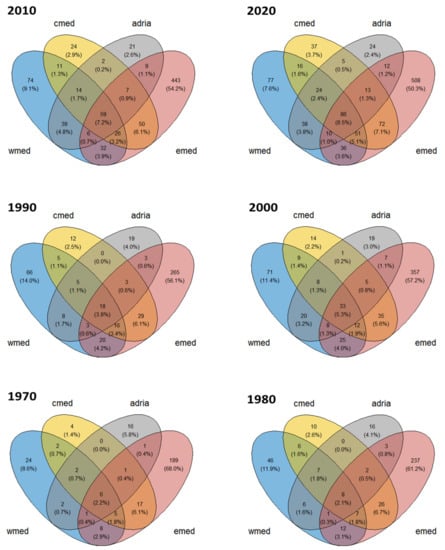 Cumulative number of species that are unique to or shared between the four Mediterranean subregions at a decadal scale between 1970 and 2020. Each intersection in the Venn diagrams represents the number (percentages in parentheses) of species contained only within the specific combination of geographic areas and nowhere else. wmed = western Mediterranean, cmed = Central Mediterranean and the Ionian Sea, adria = Adriatic Sea, emed = eastern Mediterranean.