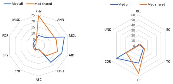 Moreover, the CMED is also distinctive among Mediterranean subregions in that the percentage of unique NIS in this area has been steadily increasing since 1970, whereas in all other subregions the percentage of unique species has been decreasing overall (Figure 4). The EMED still contains the highest number of unique species, even though the percentage has declined from 68% to 50% since 1970. In the WMED the percentage of unique species peaked at 14% by 1990 but has almost halved since, while in the ADRIA, with the smallest proportion of unique species, the decline has been steady as well. Meanwhile, the total number of species shared among all subregions has risen from six in 1970 to 86 in 2020 (2.2% to 8.5%, respectively). Among the shared species subset by 2020, polychaetes and macrophytes constitute a higher proportion compared to their percentage contribution to the total NIS diversity (Figure 5); similarly, species introduced by means of ballast water, hull fouling and aquaculture are proportionately higher in the shared subset than in the complete set of Mediterranean NIS. In contrast, Lessepsian molluscs, arthropods and fish are under-represented among the shared species of the whole basin. It is worth mentioning that the sharp increase in new NIS introductions observed in the EMED between 1990 and 2000 is also reflected in the temporal pattern of shared species between the EMED and the CMED, which was at its lowest rate (5.6%) by 2000 but started increasing again thereafter, peaking at 7.1% by the end of 2020 (Figure 4). At that time, only eight of the 72 shared EMED-CMED species were first reported in the CMED, but, even so, Corridor is implicated as a pathway of primary introduction for all eight of them (namely: Ablennes hians, Atactodea striata, Iphione muricata, Isognomon legumen, Morula aspera, Padina boryana, Priacanthus hamrur, Syphonota geographica).