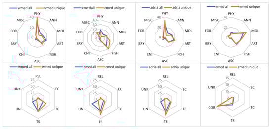 In our analysis of the trends in temporal occurrence and spatial distribution, we only considered the first new record of an NIS within each subregion. The number of species observed per 10-year cycle since 1970 were analyzed from these data sets to calculate rates in NIS introductions. Subsequently, the overlap in NIS between the four Mediterranean subregions at decadal time intervals was visualized with Venn diagrams, utilizing the package ‘ggvenn’ [79] in the R statistical environment, in order to examine the temporal evolution of the spread of NIS throughout the basin. For the purposes of this analysis, “unique” species are defined as those species that appear in one subregion only at a given time, while “shared” species are the species that are present and shared among all four subregions at that particular time. Finally, for the full dataset up to 2020, the percentage contribution of major taxa/taxa groups, as well as pathways, was calculated for the subregionally unique species and the shared species and juxtaposed with the respective values for the full subregional and regional species lists.